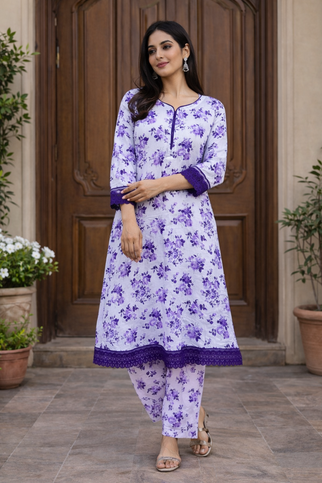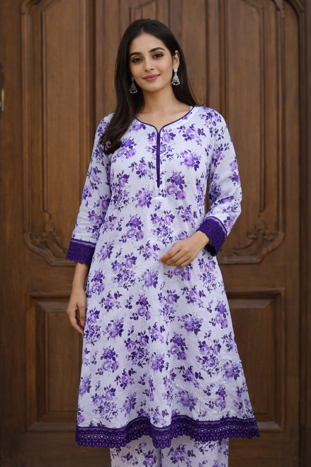 Hemline: Scalloped lace border in deep purple, adding elegance and definition