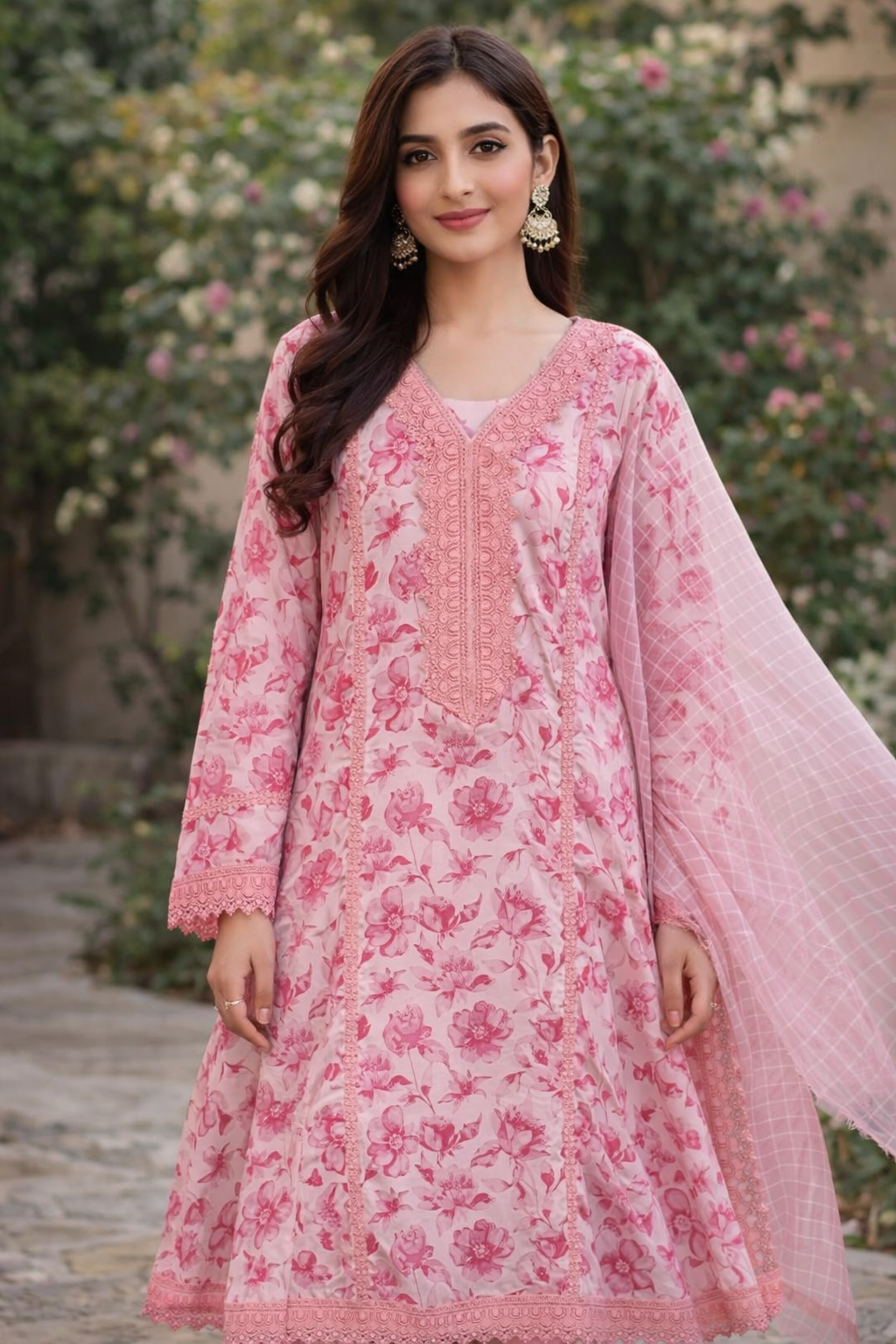 This outfit is a two-piece traditional ensemble in a soft blush pink shade, designed with a feminine and elegant aesthetic.